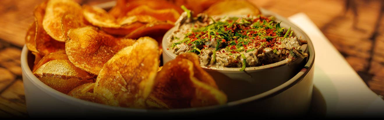Smoked French onion dip. Served with house-made potato chips